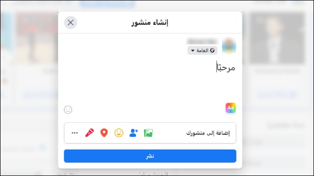 ستتوجه إلى الفيسبوك، ثم إلى ملفك الشخصي ، ستدخل إلى نافذة “إنشاء منشور” ثم ستقوم بكتابة أي كلمة أو نص ثم الضغط على “نشر”.