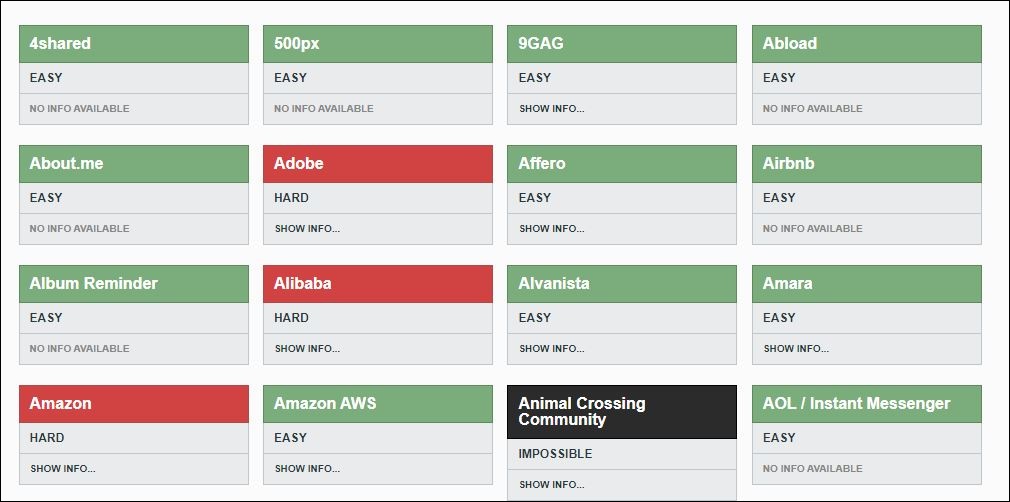 وأخيرًا، يبقى اللون الأصفر الذي يعبر غالبًا على أن إمكانية إزالة حسابك على تلك الخدمة متوسطة، وقد تحتاج الى إجراءات إضافية للقيام بذلك، كإثبات هوية أو تقديم وثائق وغيرها.
