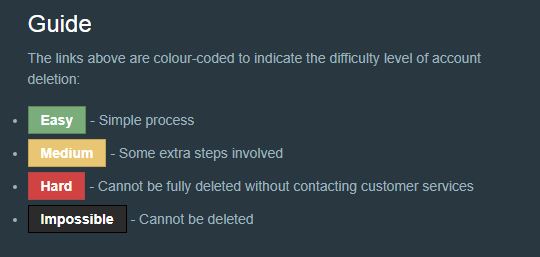 أما اللون الأخضر فمن السهل ازالة حسابك وفي الغالب ستجد رابط مباشر للقيام بذلك. واللون الأسود يدل على عدم إمكانية ازالة الحساب نهائية، وقد تضطر الى التواصل مع الدعم في بعض الحالات.