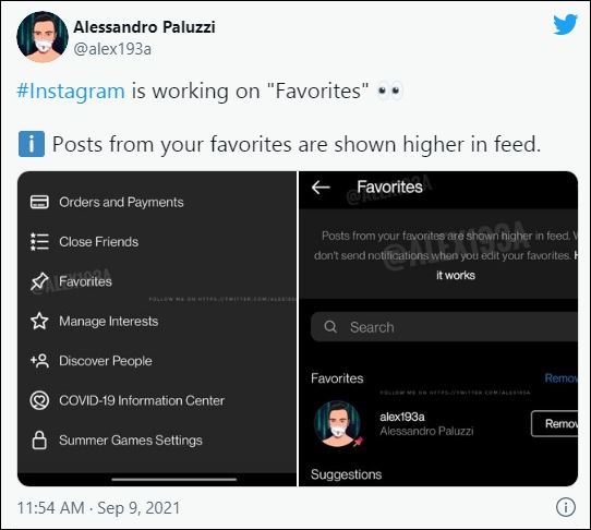 قام المدعو Paluzzi بنشر لقطات شاشة عبر حسابه الرسمي على Twitter ليوضح الميزة الجديدة. يمكن للمستخدمين البحث عن حسابات Instagram التي يتابعونها لإنشاء قائمة المفضلة. هذه القائمة قابلة للتعديل في أي وقت.