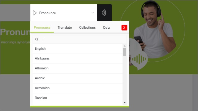 بعد ذلك سيتوفر لديك خيار بقيمة افتراضية Pronounce عند الضغط عليه، يمكنك الاختيار من بين أربعة اختيارات: النطق، الترجمة، المجموعات، واختبار. في حال محافظتك على الخيار الأول ستختار لغة الكلمة.