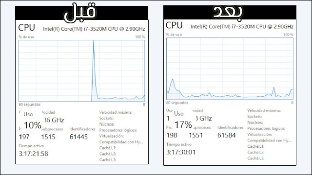 في الصورة المقابلة نرى معدل استهلاك المعالج العادي (قبل الضغط) والذي يصل إلى 10%، يرتفع معدل استهلاك المعالج مباشرة بعد الضغط على خيار “التحديث” ويصل إلى 17% مما يسبب بطئ الحاسوب قليلًا.