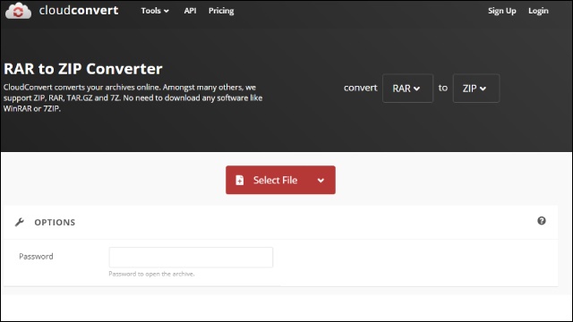 في هذه الحالة، لحل المشكلة يتوجب عليك الانتقال الى CloudConvert لتحويل صيغة الملف من RAR الى ZIP. ستقوم برفع الملف وإكمال الخطوات المتبقية لبدء تحويل الصيغة.